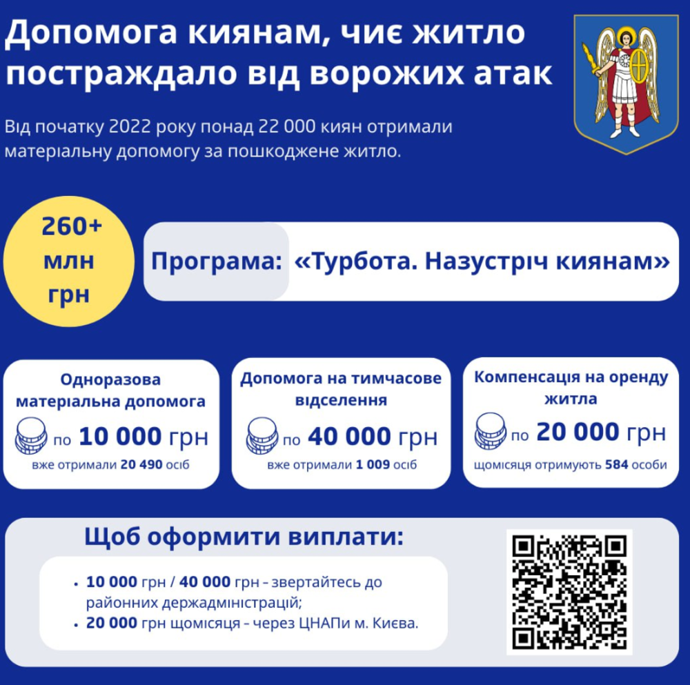 “Понад 22 000 киян отримали допомогу за пошкоджене житло”, – повідомляє КМДА