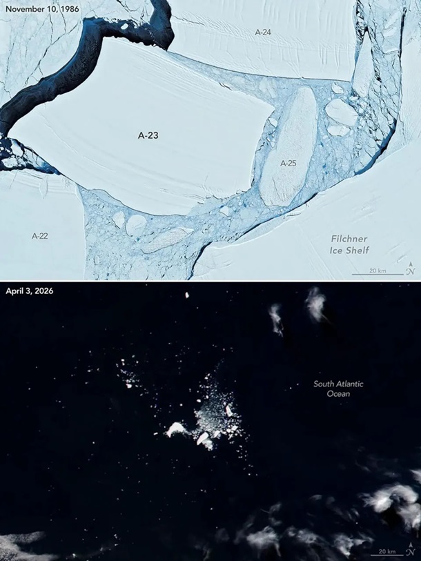 Льодовий гігант A23a після майже 40 років існування втратив 99% своєї площі та перетворився на дрібні фрагменти.
