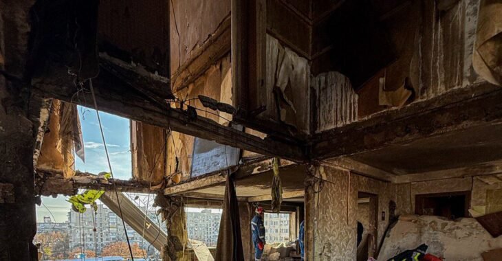 У ніч на 14 листопада Київ зазнав масованого комбінованого удару з боку російських військ. Один з епізодів атакував 9-поверхівку, яка повністю зруйнована зсередини, залишивши десятки людей без даху над головою.