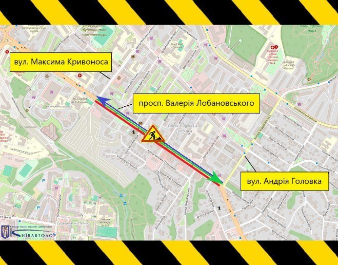 Ще одне довготривале обмеження діє на проспект Валерія Лобановського — на ділянці від вулиці Максима Кривоноса до вулиці Андрія Головка. Роботи триватимуть до 29 травня.