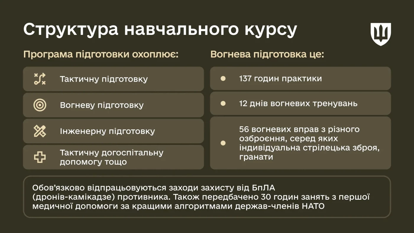 «Оновлена програма викладається у всіх навчальних центрах, які готують мобілізаційні кадри Збройних Сил України. Із 51 доби підготовки 42 доби відведено на практичні та теоретичні заняття, 7 діб – вихідні та 2 доби – на вирішення адміністративних питань», – йдеться у повідомленні.