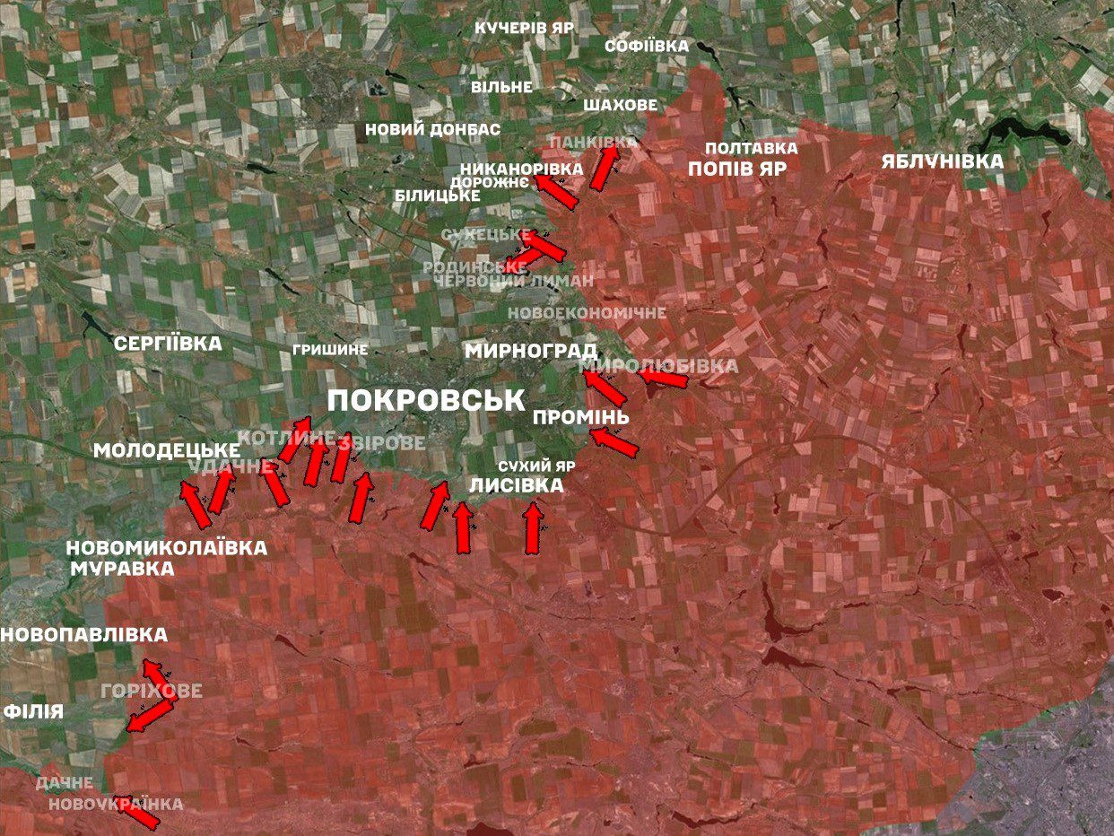 Згідно зведення, на Покровському напрямку наші захисники зупинили 79 штурмів агресора у районах населених пунктів Никанорівка, Панківка, Сухецьке, Родинське, Миролюбівка, Промінь, Лисівка, Покровськ, Звірове, Молодецьке, Котлине, Удачне, Новоукраїнка та Горіхове.