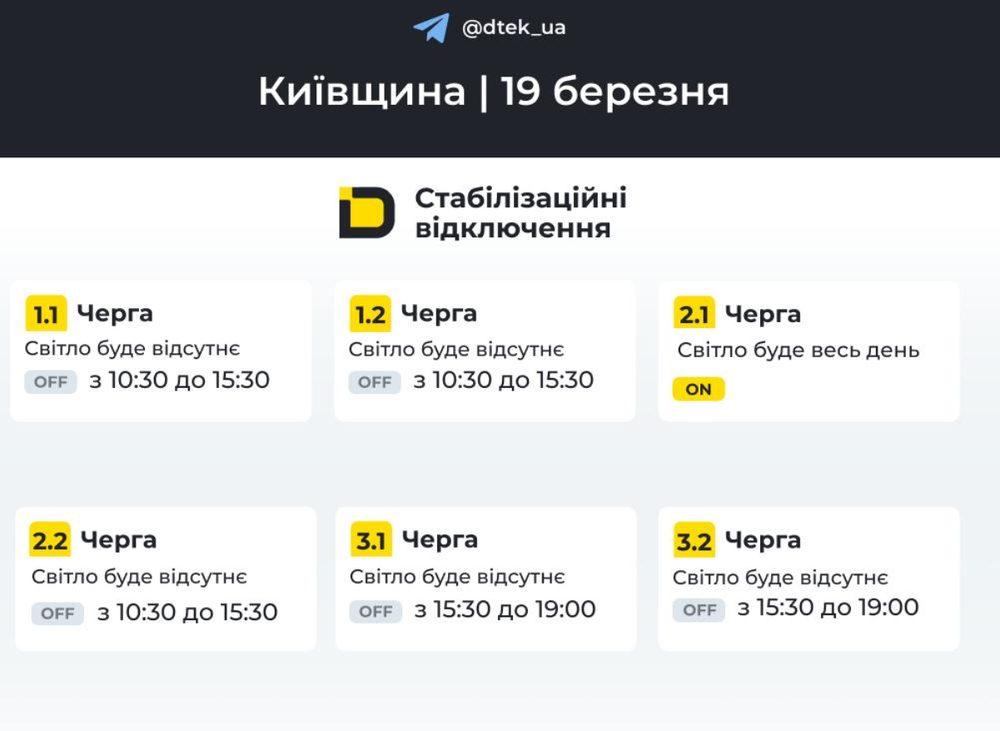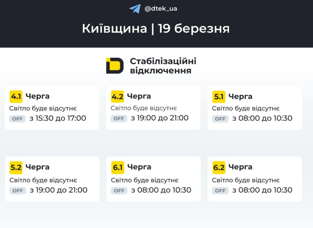 Сьогодні, 19 березня, на Київщині ввели відключення світла. Про це повідомляє ДТЕК.